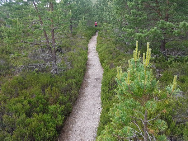 At bang on 17 miles we hit the top of the pass and I could see Aviemore far away in the distance. Woohoo, all downhill from here. The path though was narrow and rocky and I was too tired to muster the nimble mountain goat technique that is needed on this sort of technical trail. As it got lower the path slowly improved and then it was a gentle cruise downhill eventually entering the forest of Rothiemurchus. This was stunningly beautiful and not at all the “flog through the forest” that I had read in someone’s account of the race. Indeed this was Scottish Highland pine forest and couldn’t have been more different to the Conifer Plantations of Northern England that I was used to.